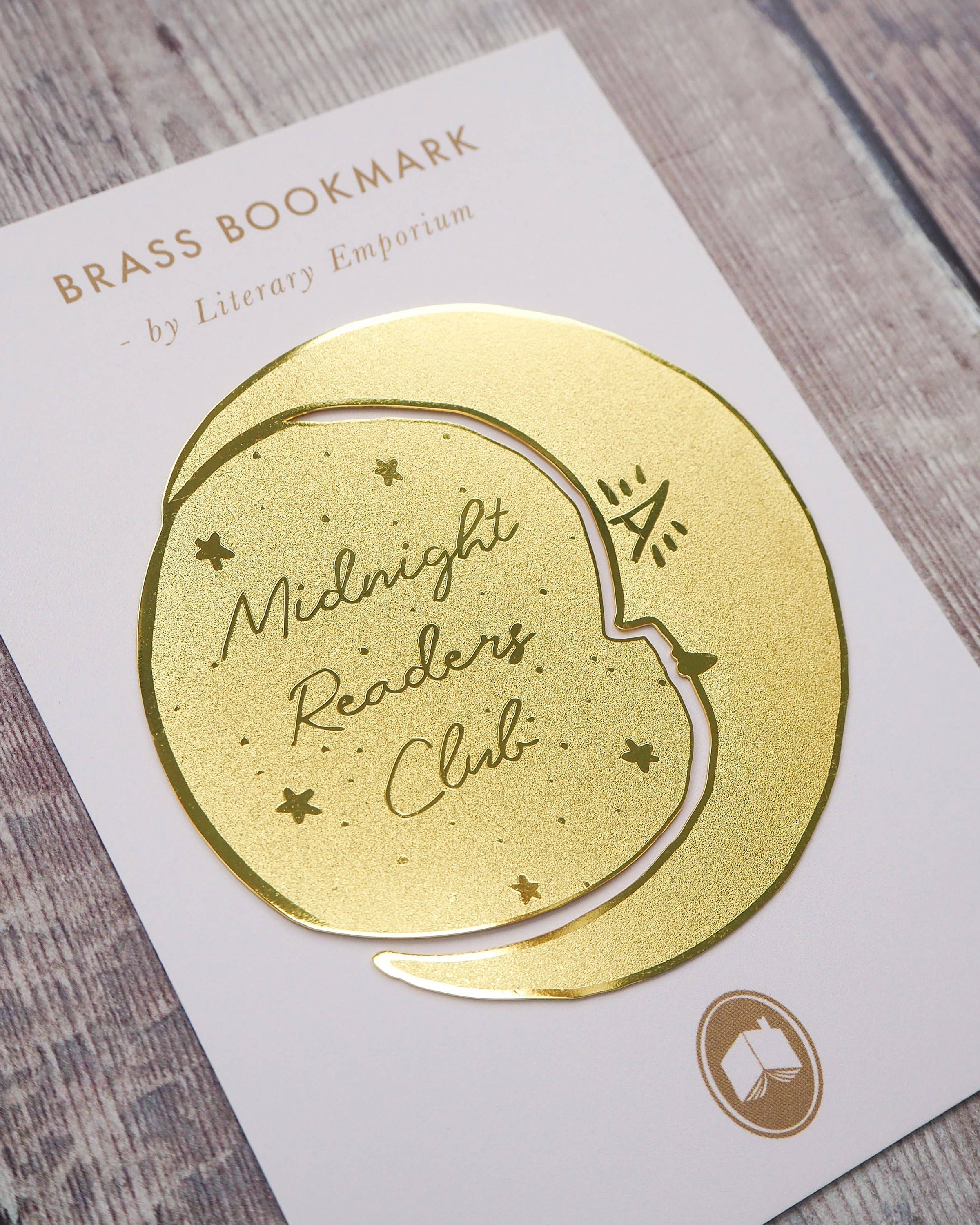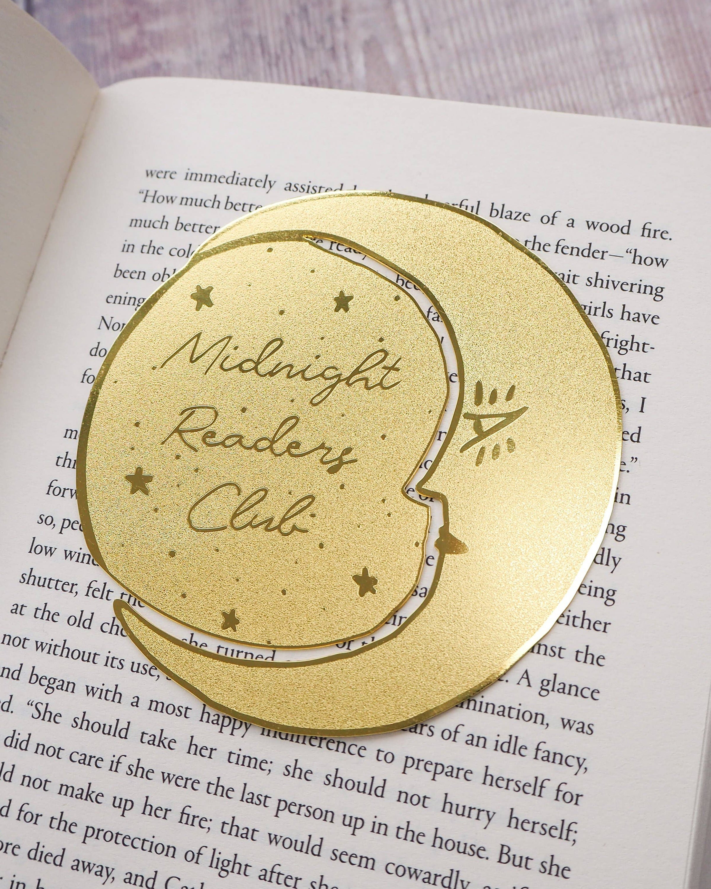 Stay up past your bedtime in style with the Midnight Readers Club Moon Brass Bookmark. Crafted from delicately etched brass, this crescent moon-shaped bookmark is adorned with celestial star details and elegant text. Slip it onto your page to keep your place as you dive into your latest late-night read.