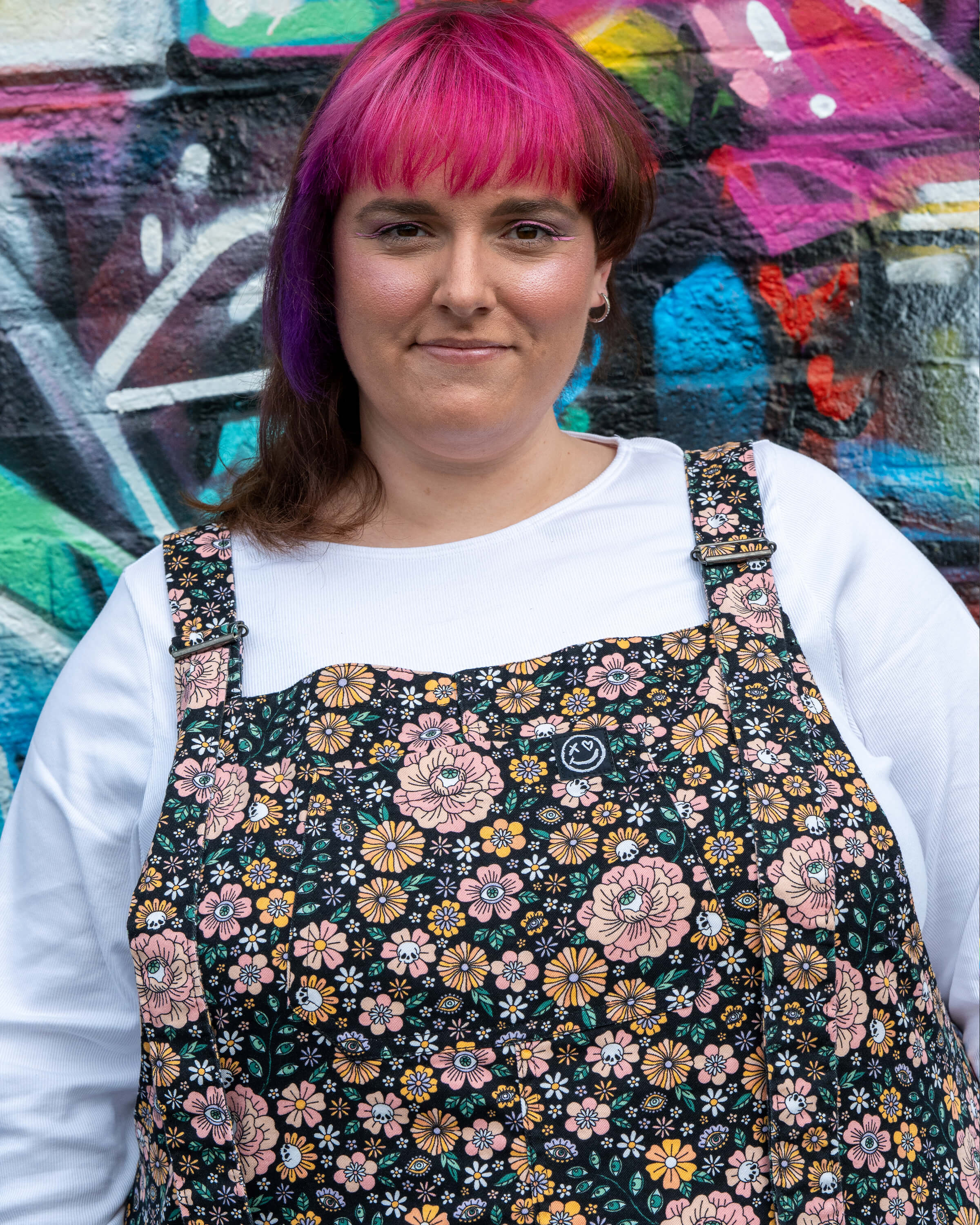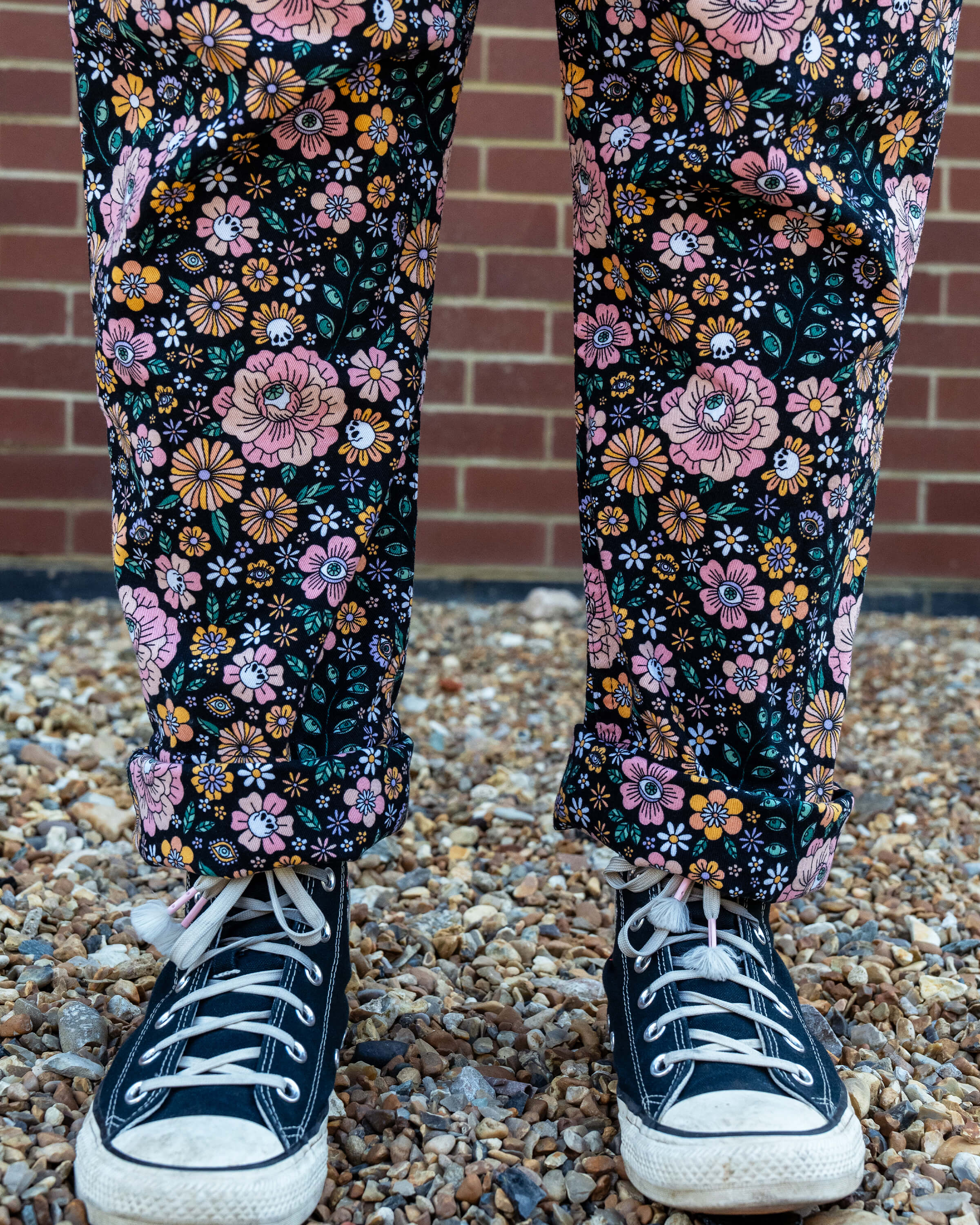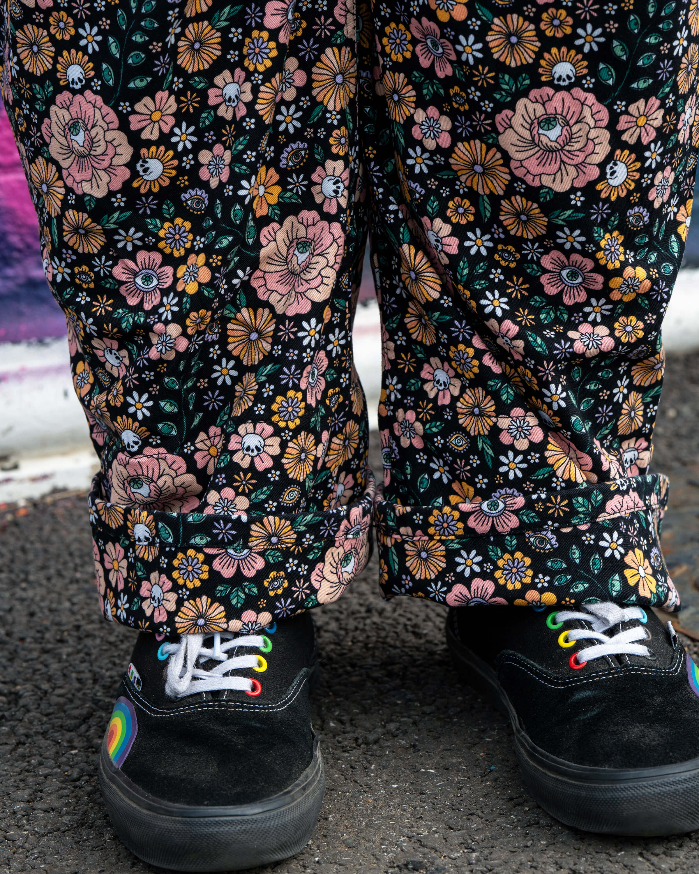 Get ready to turn heads and bloom in style! Our Eye Spy Floral Dungarees are anything but ordinary. With a bold print that mixes dreamy daisies, mystical eyes, secret skulls and power petals, these dungas are a whimsical explosion of secretly spooky florals.