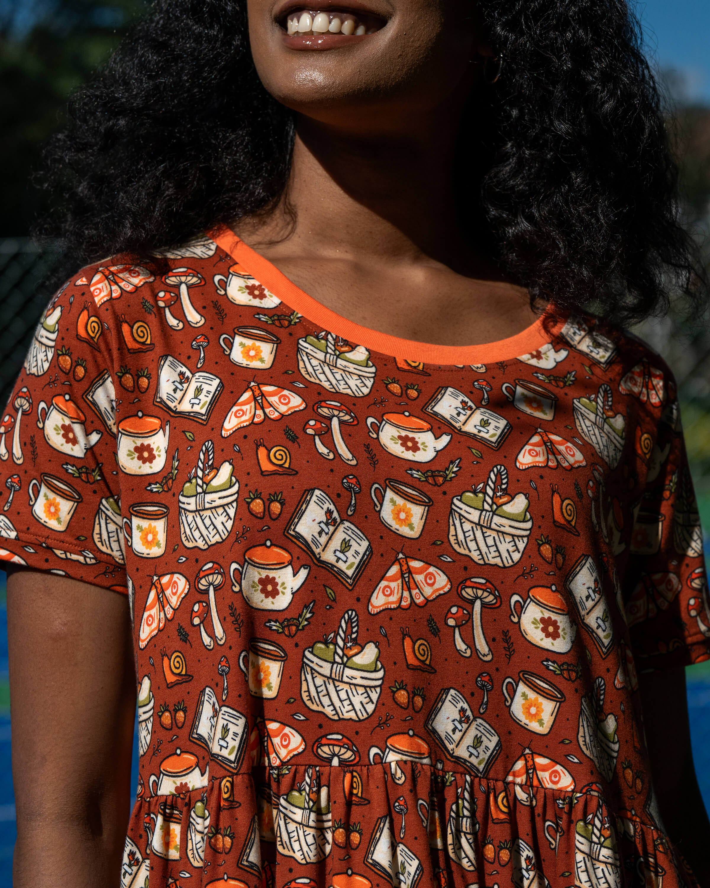 Featuring a Pixel Mushrooms print bursting with foresty, cottagecore delights, from spell books and fungi to warm cuppas and foraged baskets. Let this midi smock be your cosy companion for cooler seasons.