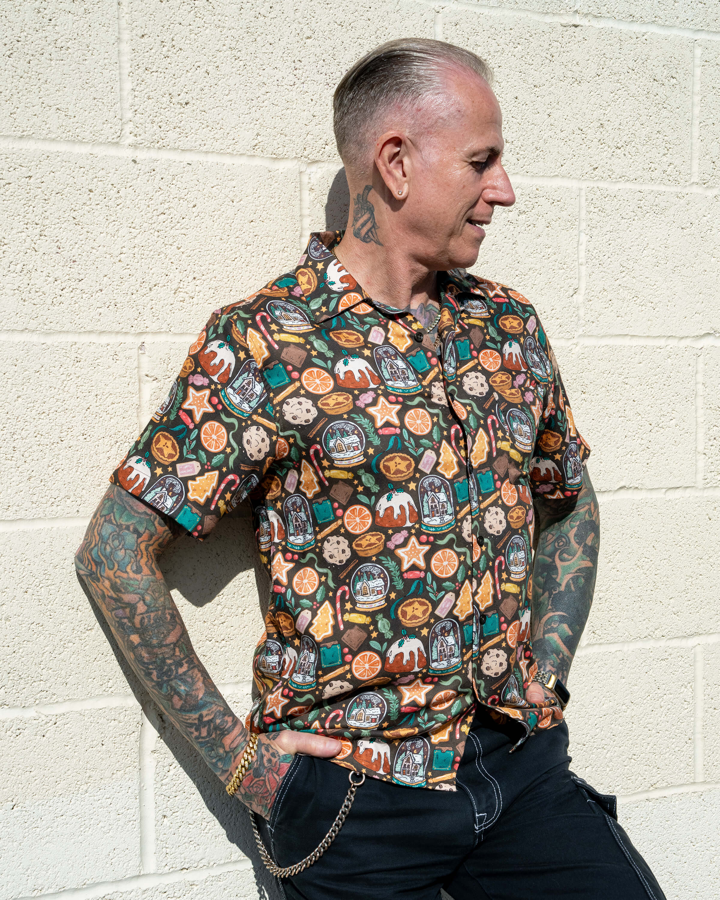 Looking like you just stepped out of a Christmas dream, our Yuletide Treats Resort Shirt is here to sleigh your wardrobe. Covered in cosy wintery snacks and illustrated delights by Freya Illustrates, this shirt is pure festive joy in fashion form. It’s made from gorgeously soft viscose that drapes like a dream, keeping you cool and comfy whether you're decking the halls or just popping to the pub.